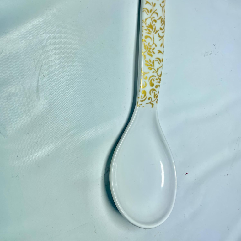 Plastic Soup Spoon with Gold Floral Pattern, White, Deep Bowl Design