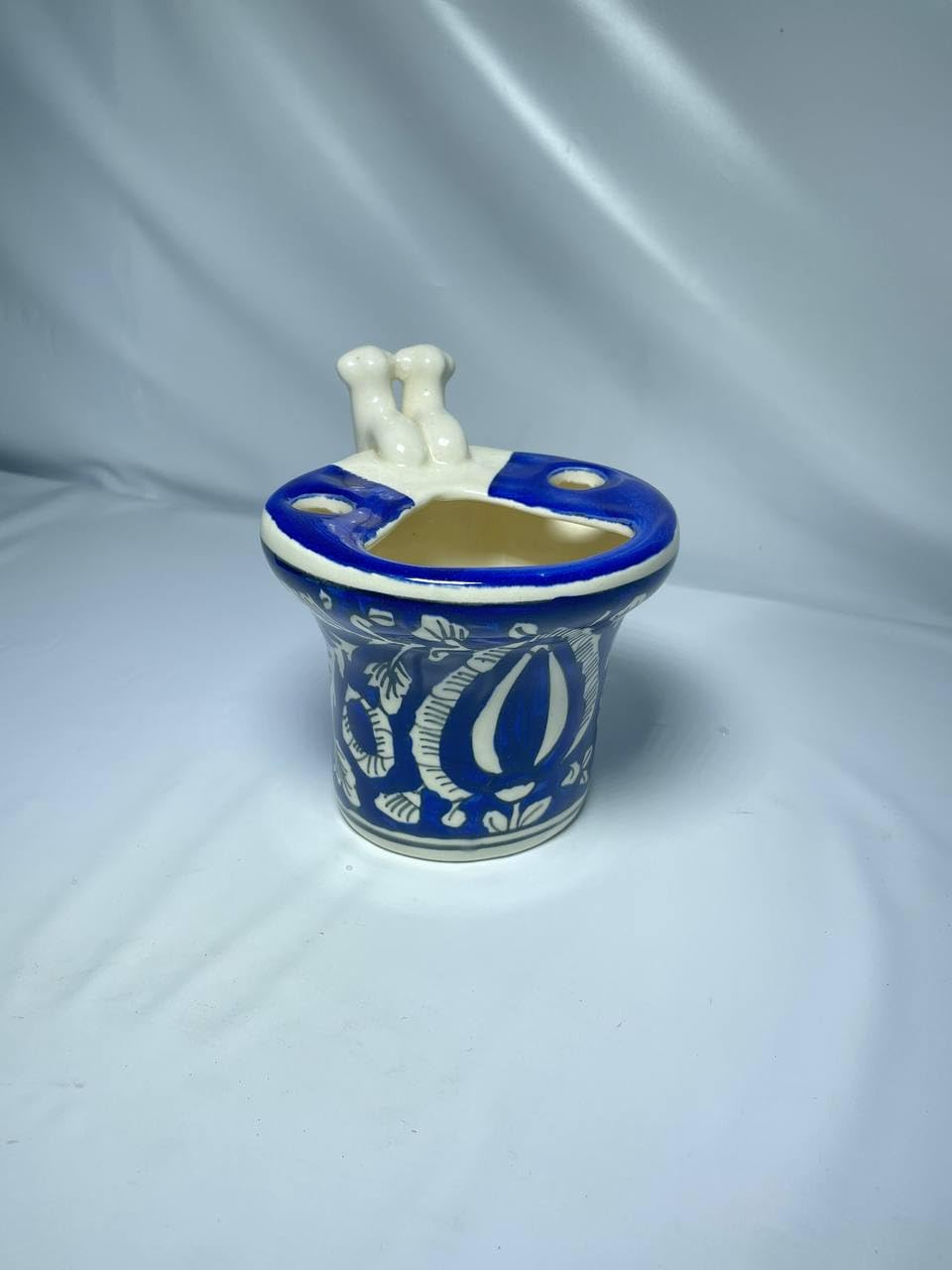 Ceramic Toothbrush Holder with Blue Floral Design, Traditional Hand-Painted Pattern, White and Blue
