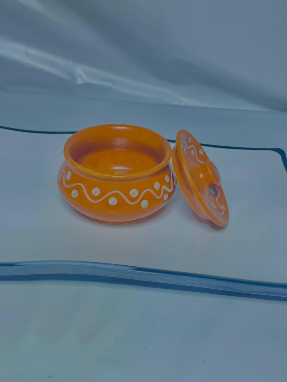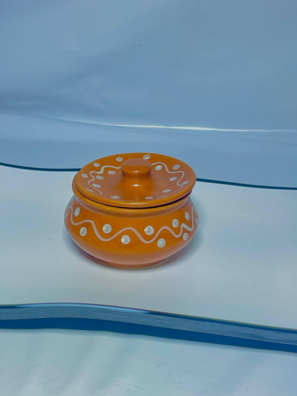 Add a touch of traditional elegance to your kitchen with this beautifully crafted ceramic storage jar. The vibrant orange finish is adorned with delicate white dots and graceful wave patterns, creating an eye-catching decorative piece that’s both functional and stylish. The well-fitted lid ensures contents remain fresh and protected, while the rounded design makes it perfect for storing spices, dry ingredients, or small kitchen essentials. This versatile container combines practical storage solutions with artistic craftsmanship, making it an ideal addition to any kitchen counter or dining table setting. The smooth ceramic construction offers durability for daily use, while its distinctive design adds a warm, cultural touch to your home décor. Whether used as a practical storage solution or a decorative accent piece, this jar brings both functionality and aesthetic appeal to your living space.