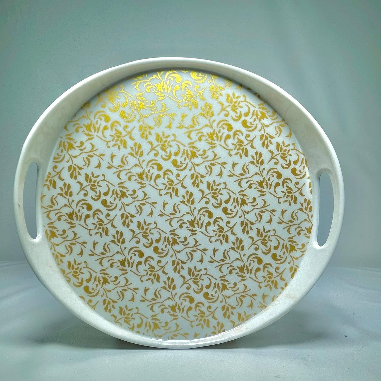 Decorative Round Serving Tray with Gold Floral Pattern, White Plastic with Handles