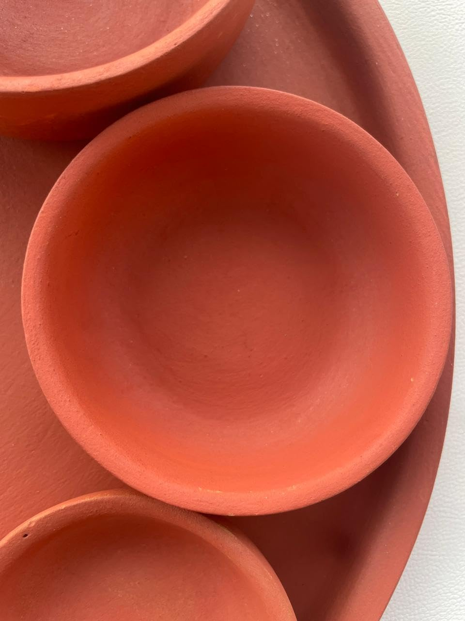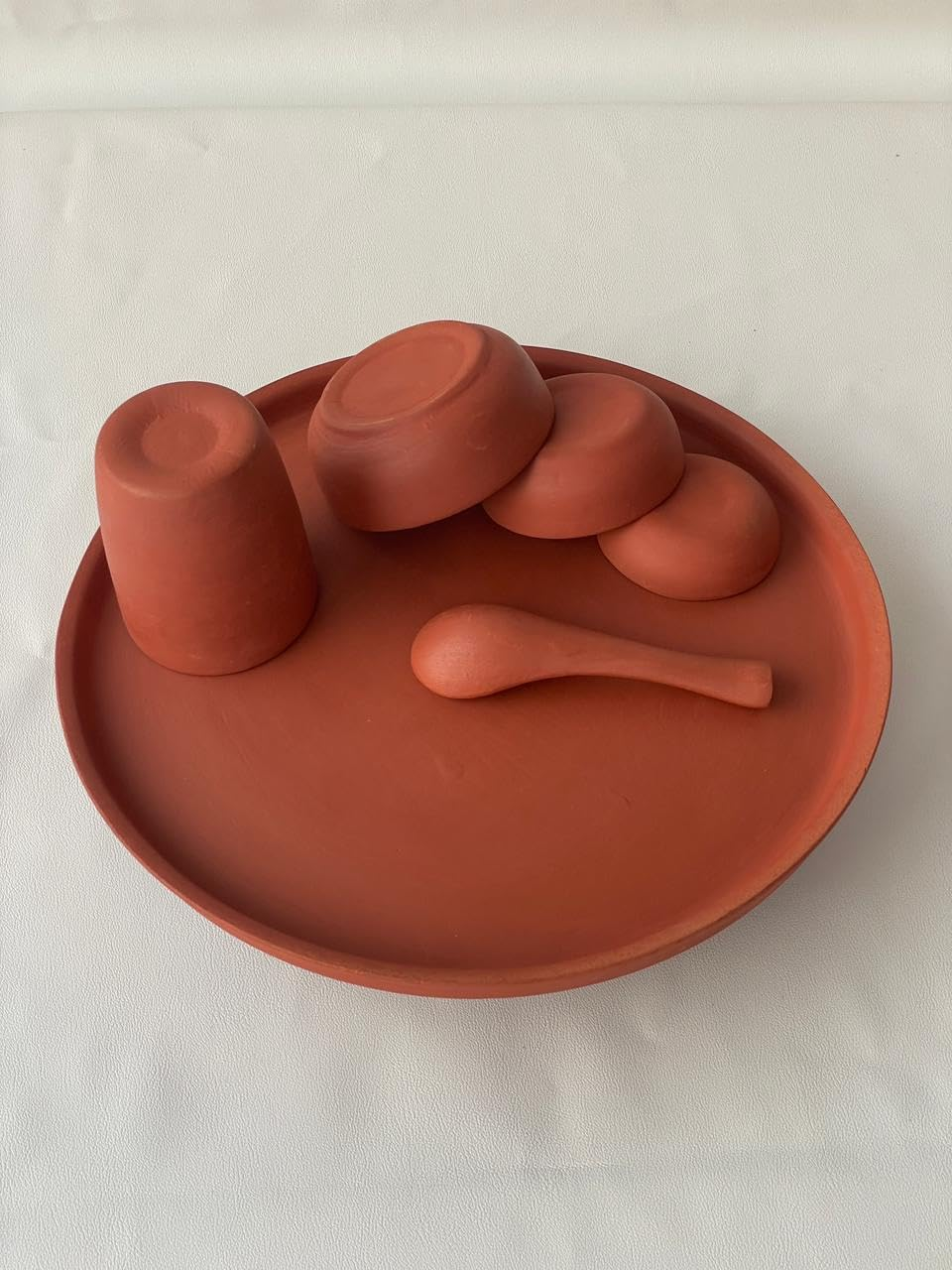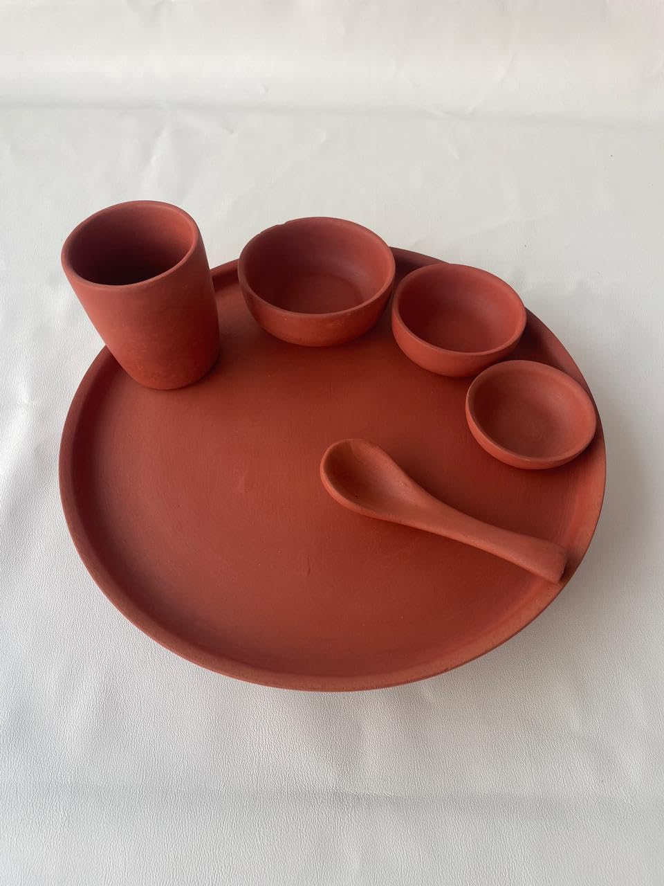Traditional Handcrafted Terracotta Dining Set, Natural Clay Thali Plate with 3 Bowls, Tumbler and Spoon, Traditional Indian Dinnerware