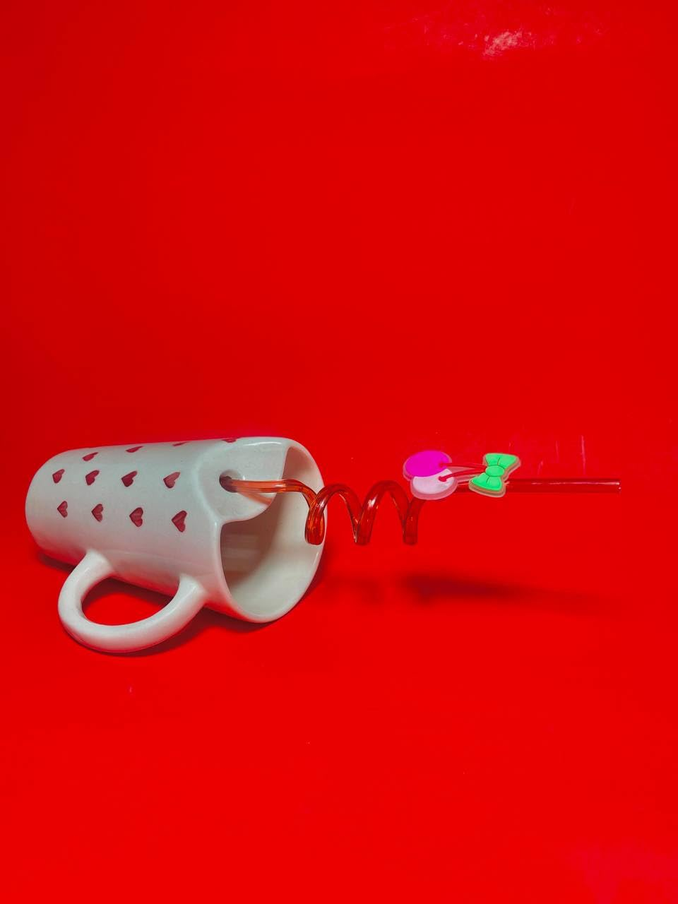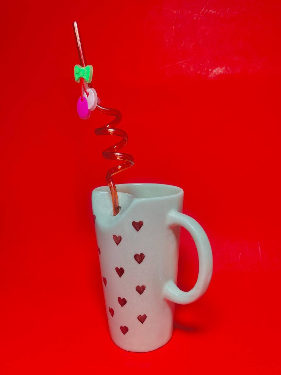 - DESIGN FEATURES: White ceramic mug adorned with charming red heart pattern and decorative hanging charms, perfect for Valentine’s Day celebrations